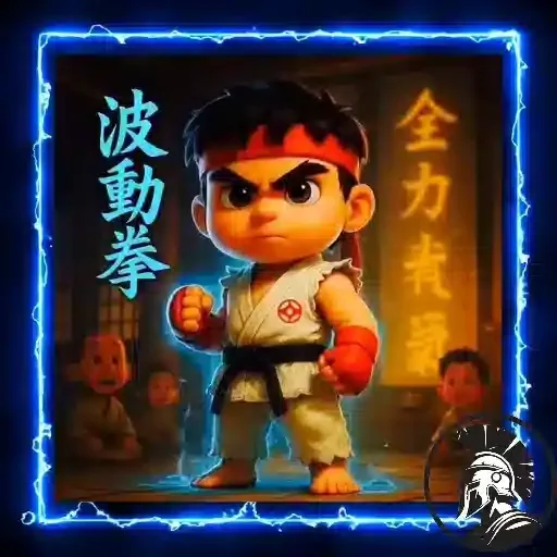 Menino de karatê em pose de luta com fundo neon e caracteres chineses. Ele usa uma faixa vermelha na cabeça e uma bandagem vermelha no punho.