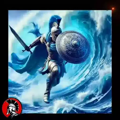 Uma mulher com armadura e cabelo azul-marinho está em pé sobre ondas do mar, segurando uma espada e um escudo. Ela parece pronta para uma batalha épica.