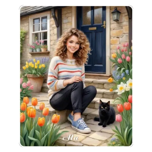 Mulher sentada na escada de uma casa com um gato preto ao lado, rodeada de flores coloridas.