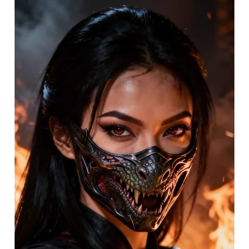 Mulher com máscara de dragão sobre fundo de chamas, com cabelos pretos e olhos castanhos.