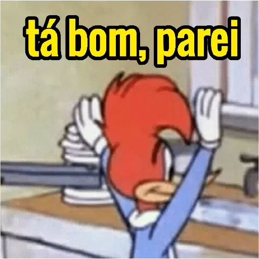 Personagem de desenho animado com cabelo vermelho e braços levantados, texto "tá bom, parei" em amarelo.