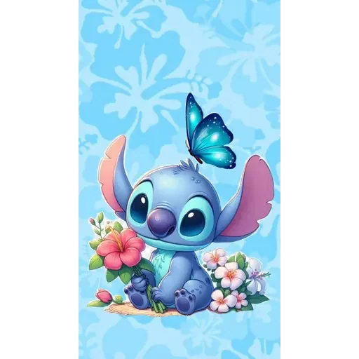 Stitch, personagem de Lilo & Stitch, sentado entre flores coloridas com uma borboleta azul sobre a cabeça, fundo azul claro com padrões de flores.