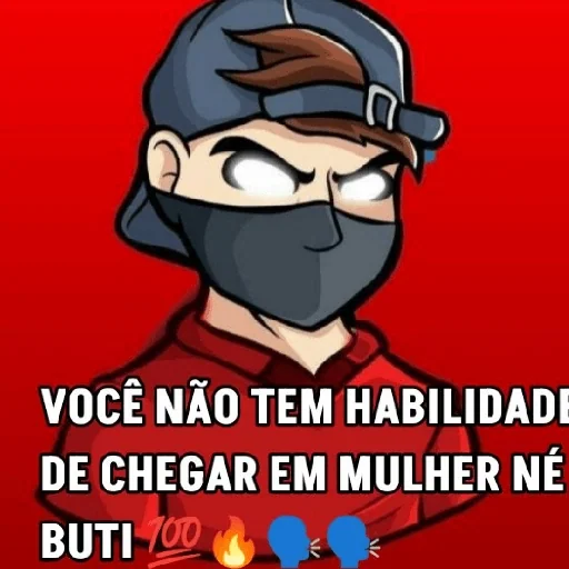 Personagem de anime com máscara e gorro, expressão séria, vestindo uma camisa vermelha. O texto 'VOCÊ NÃO TEM HABILIDADE DE CHEGAR EM MULHER NÉ BUTI' aparece abaixo, acompanhado de emojis de fogo e dois perfis.