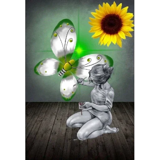 Uma mulher nua sentada no chão com uma flor de girassol e uma borboleta verde com olhos amarelos ao lado.