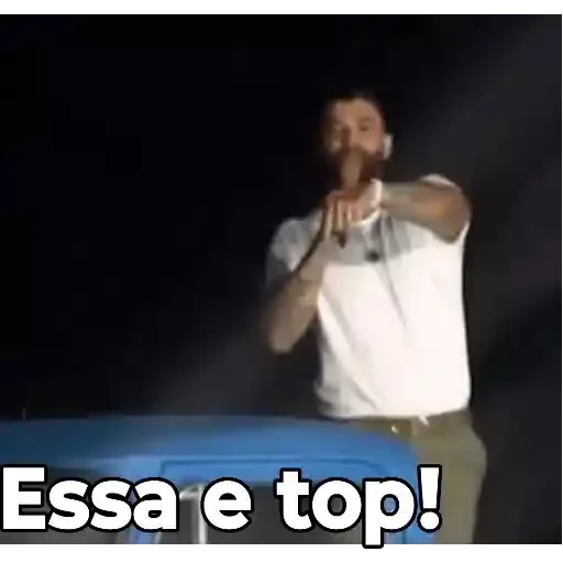 Um homem com barba e cabelo curto, vestindo uma camiseta branca e calça, aponta o dedo para o espectador com uma expressão séria. Ele está em frente a um fundo escuro e uma superfície azul, com o texto 'Essa é top!' na parte inferior.