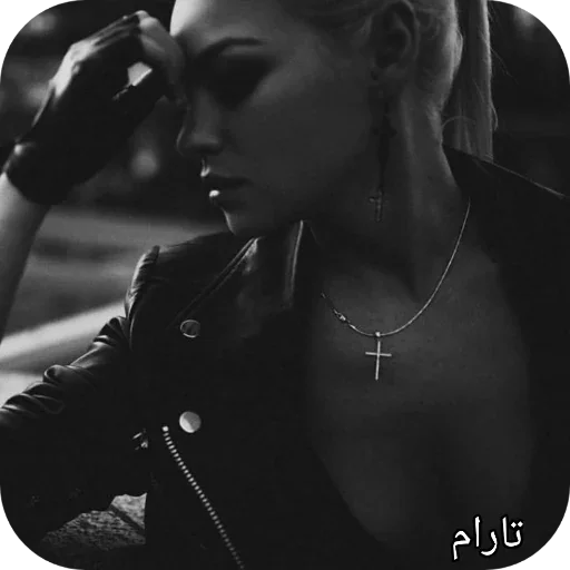 Uma mulher de meia-lua com um brinco de cruz, vestindo um casaco de couro preto e com a mão na testa, com texto em árabe no canto inferior direito.