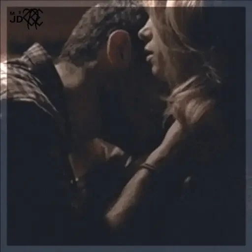 Um casal se beijando ao entardecer, com o homem de cabelos castanhos e a mulher de cabelos loiros, ambos com expressões românticas.