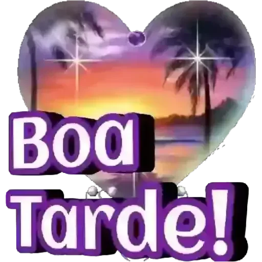 Coração com cenário de pôr do sol tropical, palmeiras e texto 'Boa Tarde!' em letras grandes.