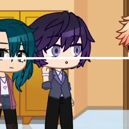 Dois personagens de anime, um menino com cabelo roxo e um look surpreso, e uma menina com cabelo verde, com expressão de desaprovação. Fundo laranja.
