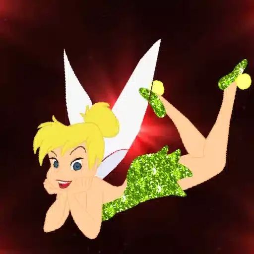Tinker Bell, fada de Peter Pan, com vestido verde brilhante e asas brancas, sorrindo contra um fundo vermelho escuro.