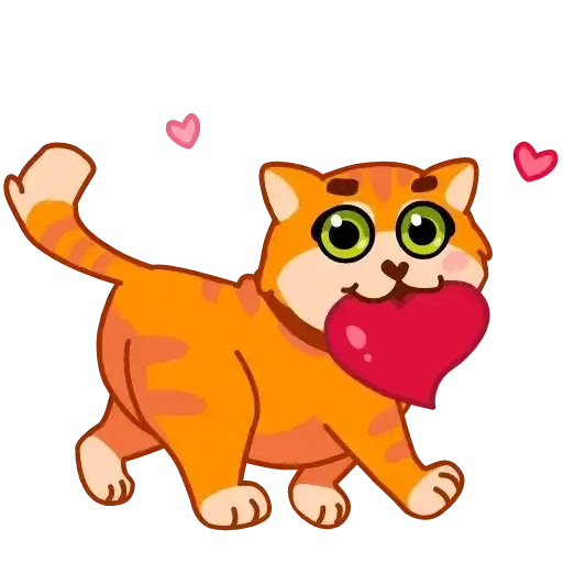Gato laranja com olhos verdes grandes segurando um coração vermelho na boca. O gato tem manchas laranja e rosa, e há dois corações rosa flutuando ao lado.
