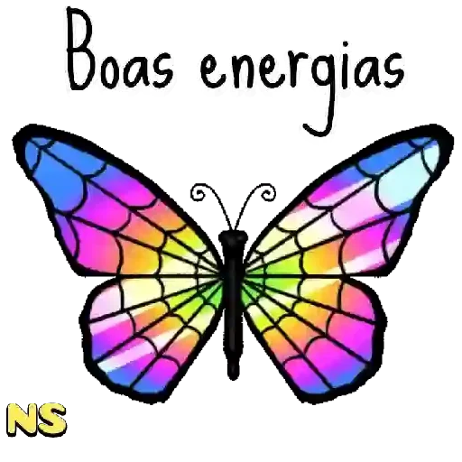 Borboleta colorida com asas de cores arco-íris e o texto 'Boas energias' em cima, com 'NS' no canto inferior esquerdo.