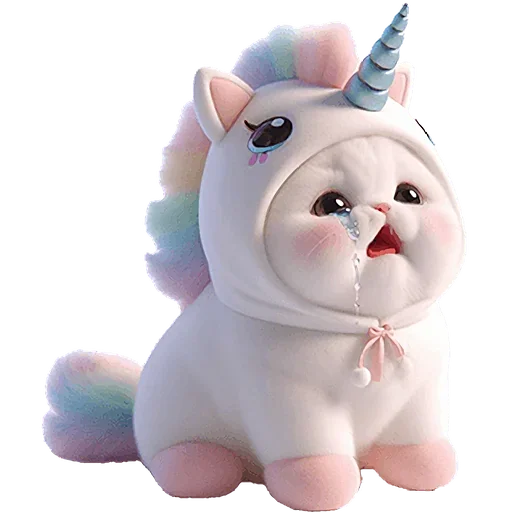 Um unicórnio fofinho com pelagem branca e arco-íris, com chifre azul, olhos grandes e rosado nas bochechas.