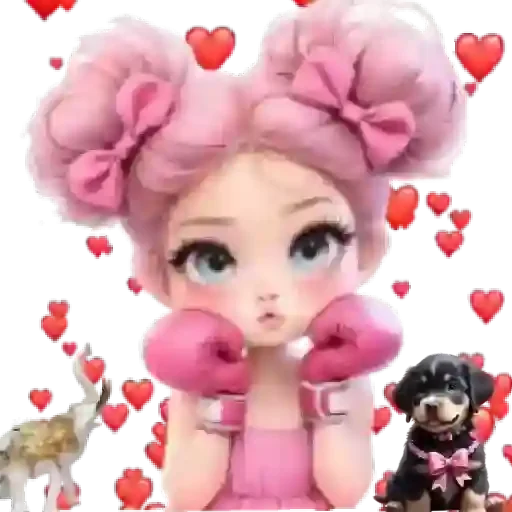 Menina fofa com roupa rosa e luvas de boxe, cachorros e corações vermelhos ao redor.