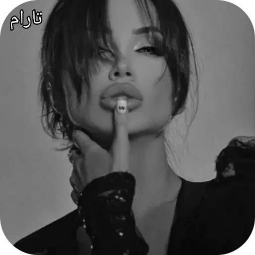 Uma mulher com o dedo indicador sobre os lábios, fazendo o gesto de silêncio. Ela tem cabelos escuros e veste roupas escuras. Há um texto em árabe no canto superior esquerdo.