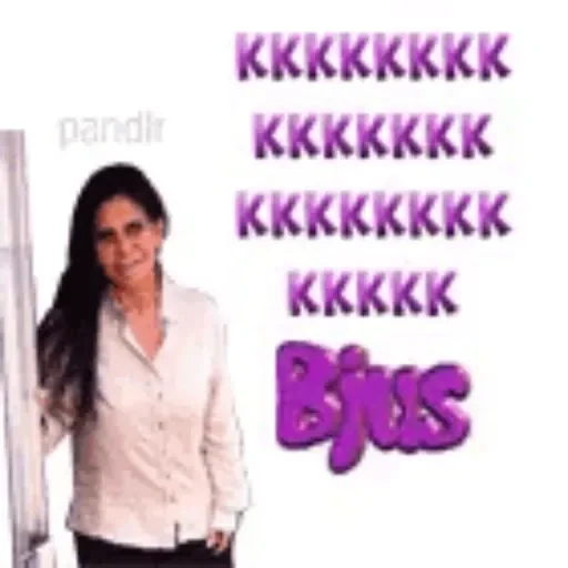 Uma mulher de cabelo preto longo vestida com uma camisa branca e calça preta ao lado de uma janela, com a expressão séria e várias linhas de texto 'KKKKKKKK' e 'Bjus' em roxo.