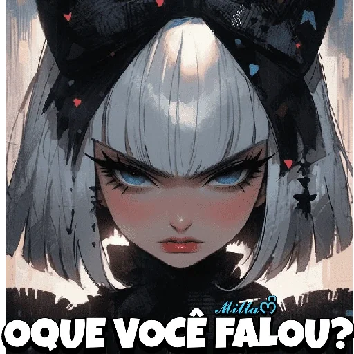 Uma ilustração de uma mulher com cabelo cinza e branco e um chapéu preto com estrelas e corações. Ela tem uma expressão facial séria e os dizer 'OQUE VOCÊ FALOU?' em letras brancas na parte inferior.