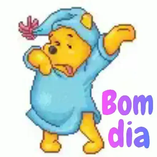 Ursinho Winnie Pooh vestido com uma camisola azul e touca com pompom rosa, fazendo um gesto com as mãos e com a língua para fora, ao lado do texto 'Bom dia'.