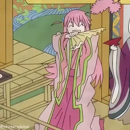 Uma garota de anime com cabelo rosa e um quimono rosa e verde está em uma pose curiosa, com um fundo que parece uma sala japonesa.
