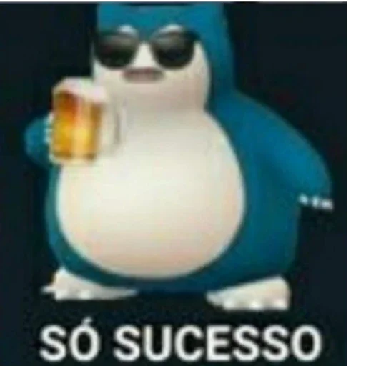 Um pinguim de óculos escuros e capuz azul, segurando uma cerveja e com a frase 'SÓ SUCESSO' abaixo.
