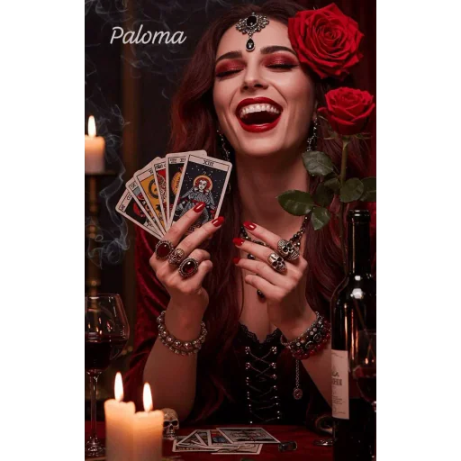 Uma mulher com cabelos castanhos e olhos arregalados, adornada com uma rosa vermelha no cabelo e joias, segura cartas de tarô em uma mão e uma carta específica na outra, com velas acesas ao fundo. O nome 'Paloma' aparece no canto superior esquerdo.