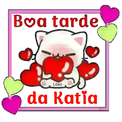 Um gato branco fofinho com corações vermelhos ao redor, olhos fechados e um coração grande na frente da cara. A imagem tem um quadro rosa e corações coloridos nos cantos. O texto 'Boa tarde da Katia' está escrito em vermelho.