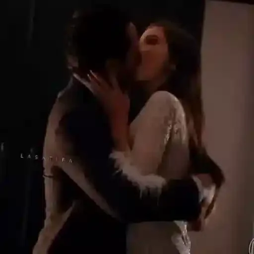 Um casal se beijando, com o homem de camisa escura e a mulher de camisa clara, em um ambiente com iluminação suave.
