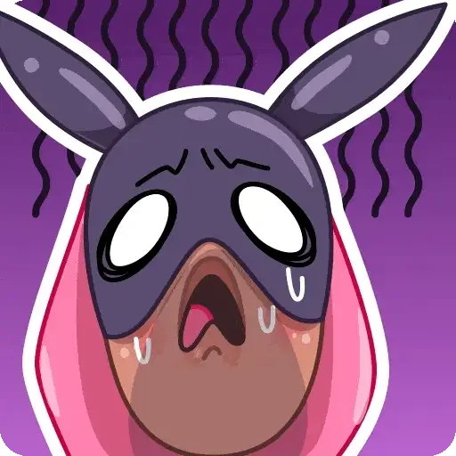Um personagem de anime com máscara roxa e orelhas de coelho, com expressão de surpresa ou choque, fundo roxo.