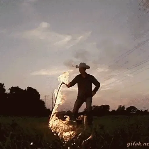 Um homem de chapéu está em um campo, jogando algo que parece ser uma rede ou uma corda com fogo nela, ao pôr do sol.