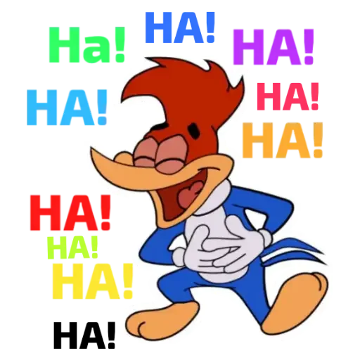 Um desenho do Woody Woodpecker, um pica-pau de um olho, com uma expressão engraçada e vários 'HA!' coloridos ao redor.