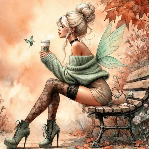 Uma fada com asas verdes sentada em um banco, segurando um copo de café, com cabelo loiro preso em um coque e vestindo um suéter verde e botas de salto alto.