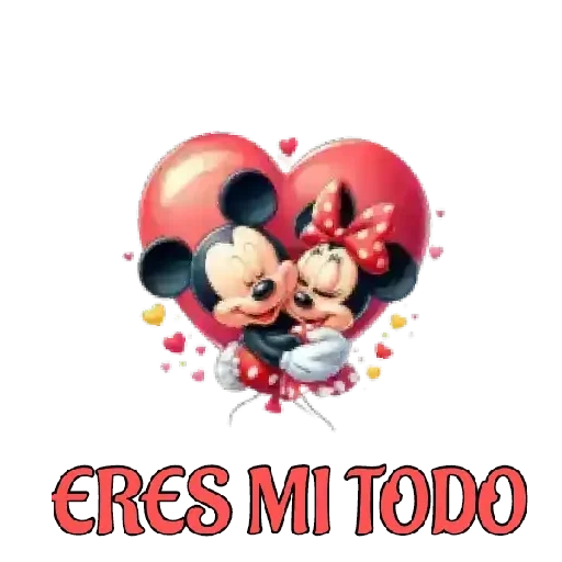 Mickey e Minnie Mouse abraçados dentro de um coração vermelho gigante, com balões e corações ao redor. Abaixo deles, está escrito 'ERES MI TODO'.