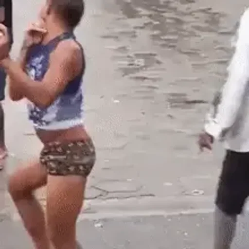Homem de shortinho dançando na rua, com um top azul e cabelo curto.