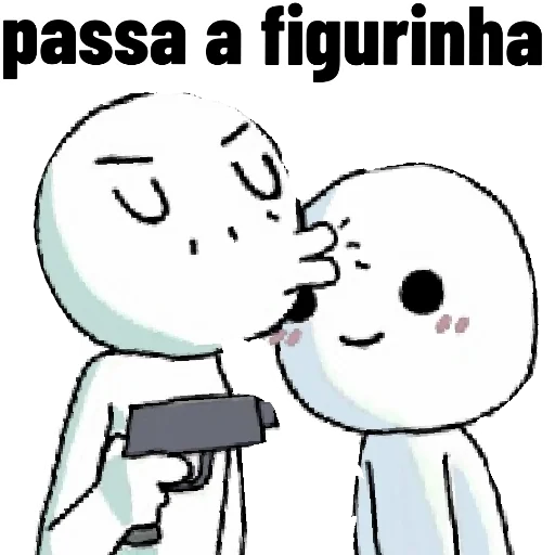 Dois personagens de desenho animado, um apontando uma arma para a cabeça do outro, com a legenda 'passa a figurinha'. O personagem da esquerda tem expressão de malícia, enquanto o da direita aparenta felicidade ou surpresa.