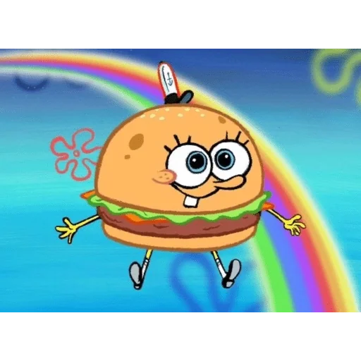 Um hambúrguer antropomórfico com olhos grandes e sorriso feliz, saltando em frente a um arco-íris. O hambúrguer tem alface e tomate.