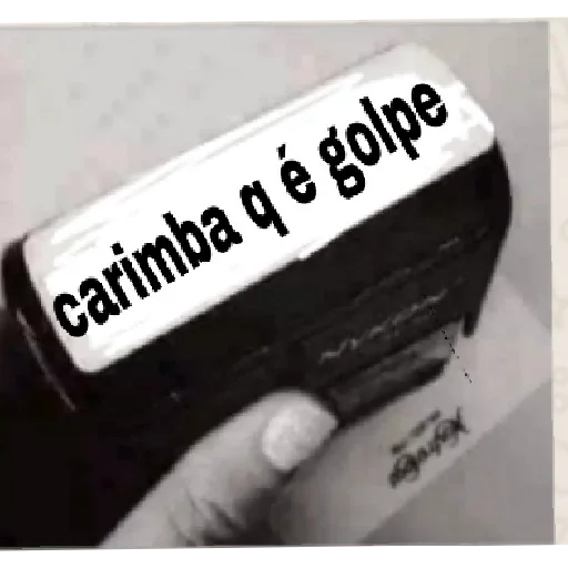 Uma mão segura um carimbo com a inscrição 'carimba q é golpe' em uma superfície branca.