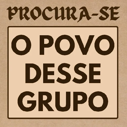 Um anúncio com texto 'PROCURA-SE O POVO DESSE GRUPO' em letras grandes e pretas em um fundo bege.
