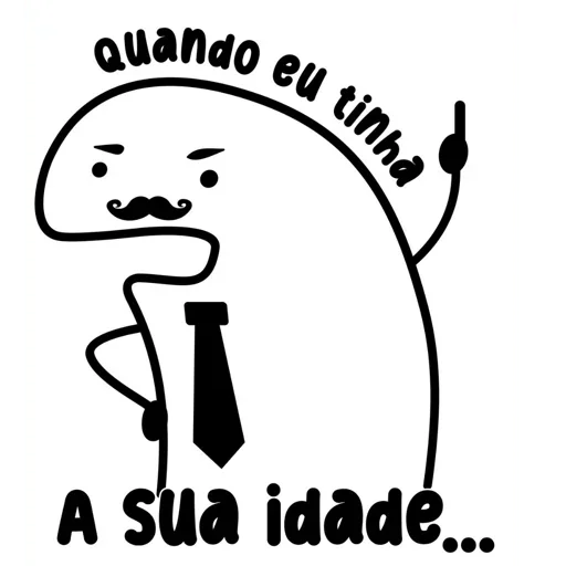 Um personagem de desenho simples com bigode e gravata, fazendo um gesto com a mão. Ele está cercado pelo texto 'quando eu tinha' na parte superior e 'A sua idade...' na parte inferior.