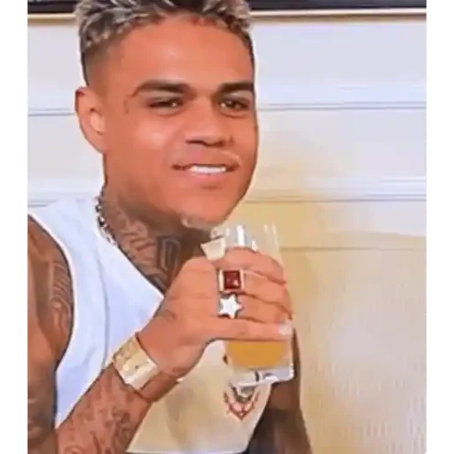 Homem com cabelo curto e tatuagens, vestindo uma camiseta branca e um relógio, segurando uma garrafa de bebida amarela.