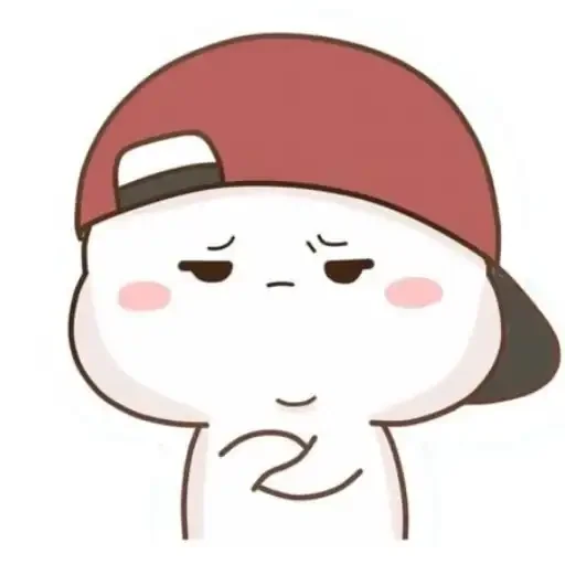 Personagem de anime com expressão pensativa, usando boné vermelho e com bochechas rosadas.