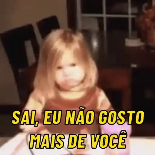 Menina loira com expressão séria e braços cruzados, vestindo uma blusa marrom, com o texto "SAI, EU NÃO GOSTO MAIS DE VOCÊ" sobreposto em amarelo.