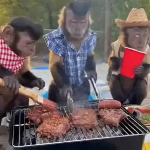 Três macacos vestidos estão grelhando carnes em uma churrasqueira. O macaco à esquerda usa um chapéu preto e uma bandana vermelha e branca, o do meio tem um cabelo espetado e uma camisa xadrez azul, e o da direita usa um chapéu de cowboy e segura um copo vermelho.