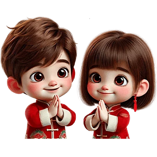 Dois personagens de anime infantil, um menino e uma menina, vestidos com roupas vermelhas tradicionais chinesas com…