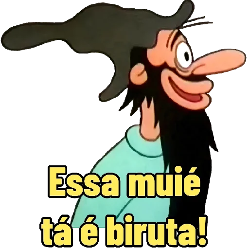 Um homem careca com bigode e barba, parecendo surpreso ou confuso, com a frase 'Essa muié tá é biruta!' em amarelo.