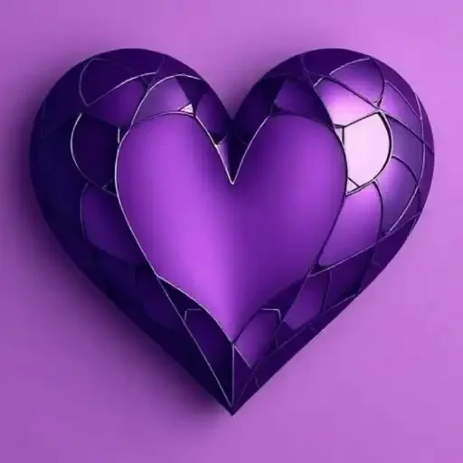 Coração roxo brilhante com reflexos de luz, em um fundo roxo.