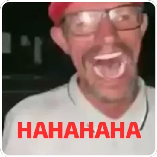 Um homem de meia-idade com óculos e um boné vermelho ri com a boca aberta. Ele está usando uma camisa branca e o texto "HAHAHAHA" aparece em vermelho na parte inferior da imagem.