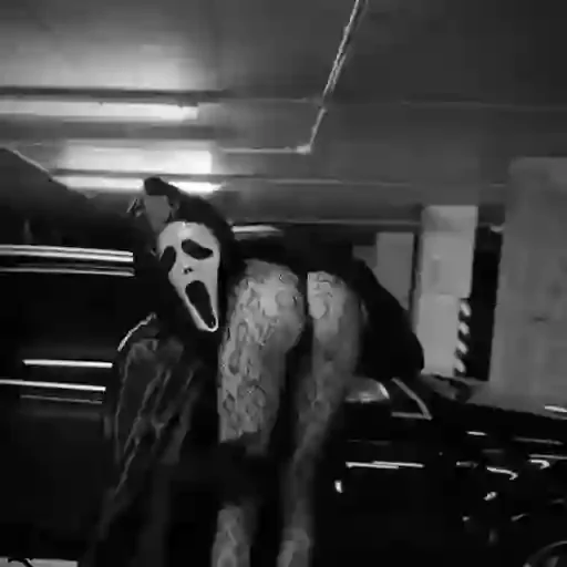 Um homem usando uma máscara branca de terror com a boca aberta em um ambiente escuro, provavelmente uma garagem ou estacionamento.