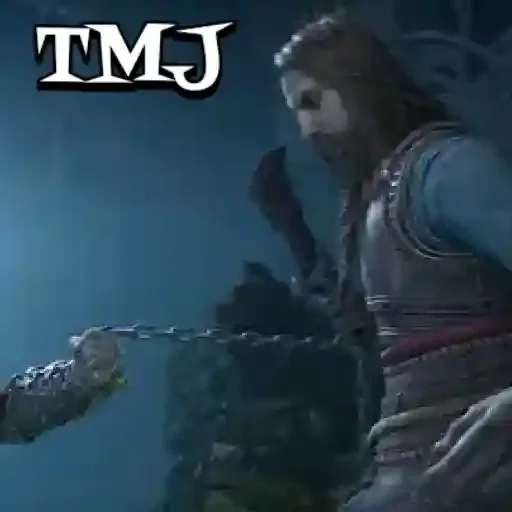 Personagem de um jogo segurando uma corrente com a inscrição 'TMJ' no canto superior esquerdo.