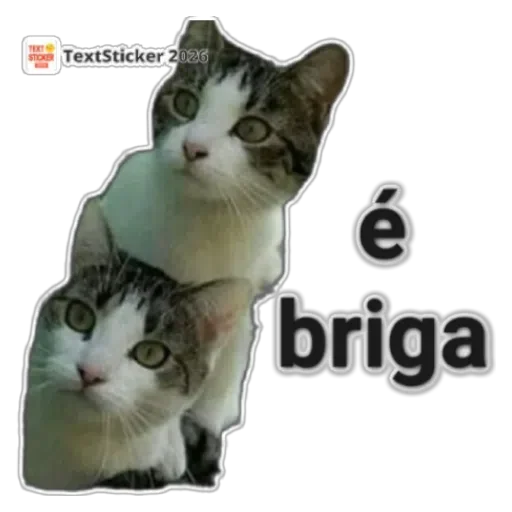 Dois gatos cinza e branco com olhos verdes olhando para frente, sobreposto com o texto 'é briga'.