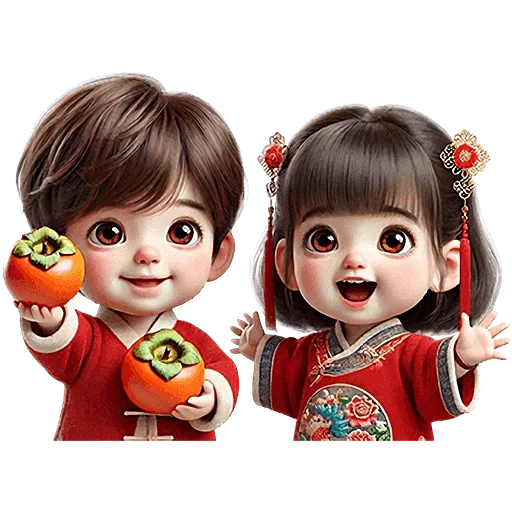 Dois crianças vestidas com roupas tradicionais chinesas segurando laranjas, com um fundo branco. A menina tem cabelos…